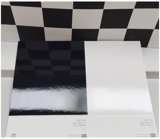 A lot of research has been carried out in the field of interaction between gloss and color, since these are the two most important appearance attributes [45,55,78,79,80]. The contrast gloss described by Hunter and Harold in 1987 seems to indeed be a crucial dimension in gloss perception [6]. Contrast gloss is more of a subjective perception rather than a standardized measurement. It refers to the perceived difference in glossiness between two adjacent areas on a surface, which can be influenced by various factors such as surface texture, reflectance, and lighting conditions [81,82]. Because of contrast gloss, darker objects are perceived as glossier, and glossier objects are perceived as darker.