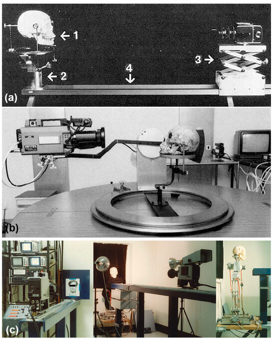 Figure 2. Example superimposition devices. (a) Brocklebank and Holmgren’s [16] superimposition gantry. Reproduced from the work presented in [16] p. 1215 with permission from ASTM International. (b) McKenna’s [28] superimposition device. Note here that the camera in this system unconventionally moves around a fixed skull—for most VS systems it is the reverse. Reproduced from the work presented in [28] p. 753 with permission from ASTM International. (c) Taylor and Brown’s [29] computer-controlled superimposition device that remotely operates the skull position (Five degrees of freedom via electric motors, and one degree (focus distance) by manual movement of the camera) via electric motors. Reproduced from the work presented in [29] with permission from Jane A. Taylor.