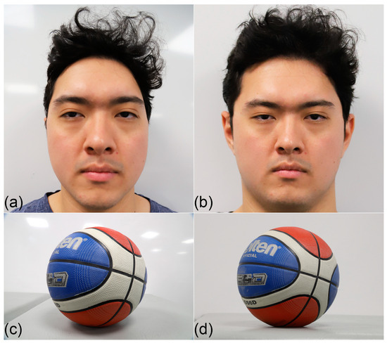 Figure 3. Example of the perspective effects of focus distance on a subject. (a) Photograph of the first author (SH) at focus distance of 0.5 m acquired with a Canon® 6D Mark II camera body fitted with a Canon® 24–105 mm zoom lens. (b) Photograph of the first author at focus distance of 3 m acquired with the same Canon® 6D Mark II camera body and Canon® 24–105 mm zoom lens as (a). Note that the subject in (a,b) is identical with images taken moments apart, but the recorded anatomical/physical appearance of the face is very different. E.g., the face appears without the ears in (a) but not in (b) due to the camera recording different peripheral edges of the face. (c) Photograph of a basketball at focus distance of 0.3 m acquired with a Canon® 6D Mark II camera body fitted with a Canon® 24–105 mm zoom lens. (d) Photograph of the same basketball in the same position as (c), but at focus distance of 1.5 m using the same Canon® 6D Mark II camera body and Canon® 24–105 mm zoom lens as (c). Note that a different amount of the printed text is visible on the basketball in (d) relative to (c) and that the focus distance sets the perspective of the subject, not the focal length of the lens [8,80].