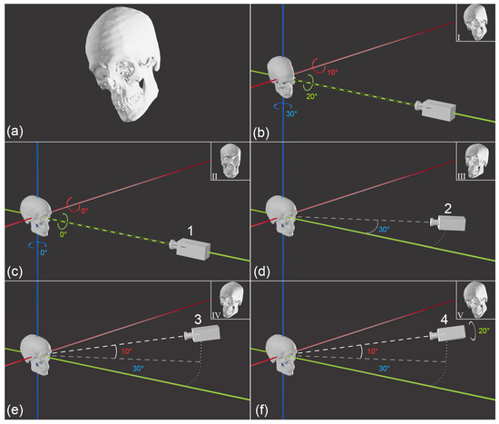 Figure 4. The equivalence of ‘skull pose’ (to a fixed camera) and camera vantage point (in relation to a fixed skull). (a) Reference view of the skull targeted by both skull pose and camera vantage point. (b) Setting the skull pose in front of a stationary camera and from a starting zero origin to x-axis rotation = 10°, y-axis rotation = −20°, z-axis rotation = −30°. The resultant camera view is shown at inset I. (cf) Matching the reference skull view via camera vantage point matching: (c) starting zero origin position; (d) step 1: camera movement on the x/y plane such that the camera line-of-sight is 20° from the y-axis; (e) step 2: additional camera movement 10° above x/y-axis plane; (f) step 3: additional camera rotation around line of sight by 20° results in the targeted reference view of the skull: compare inset I in (b) to inset V in (f). This equivalence can be further visualised in Video S1.