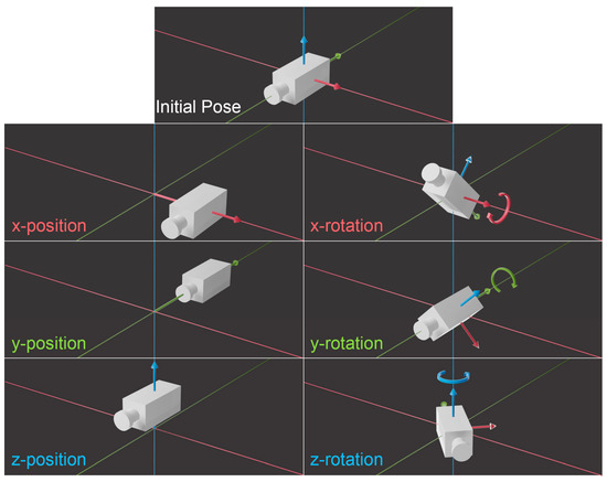 Figure 5. The 6 degrees of freedom of a camera in 3D space. Note here that the combination of x, y and z position control the focus distance parameter, such that focus distance cannot be ignored. The changes in position and rotation can be further visualised in Video S2.