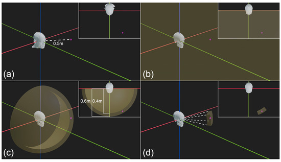 Figure 6. The importance of focus distance for restricting the plausible camera vantage point positions in VS. (a) Example ground truth camera position for face photography (pink dot at focus distance of 0.5 m). The red line represents the x-axis, the green line the y axis and the blue line the z-axis.(b) Plausible camera vantage point zone, for a frontal view face photograph, without focus distance estimation or constraints by other camera position factors (plausible zone = yellow volume). (c) Narrowing of the plausible camera vantage point zone by a focus distance estimate. Note that the yellow sphere is hollow, and a 1% perspective mismatch tolerance has been allowed for the 0.5 m focus distance estimate per [23] providing a focus distance range from 0.4–0.6 m in a spherical pattern around the skull. (d) Further narrowing of the plausible camera vantage point zone after additional constraint by the inclusion of other camera position factors and a conservative ±10° rotation error tolerance [83]. Inset for each panel shows superior view of the scene.