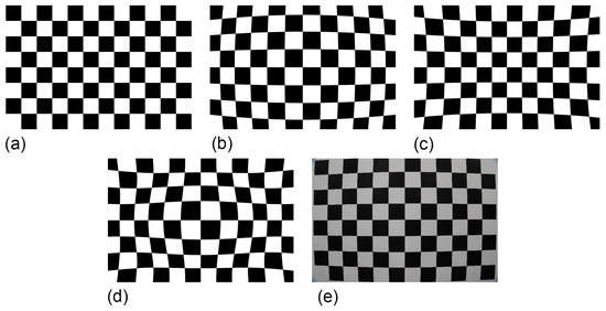 Figure 7. Examples of the different types of radial lens distortions manifested at photography of a regular square grid: (a) No distortion; (b) Barrel distortion; (c) Pincushion distortion; (d) Moustache distortion; and (e) Real-world barrel distortion from a Canon® 24–105 mm adjustable zoom lens set to 24mm focal length (and as attached to a Canon® 6D Mark II camera body).
