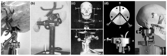 Figure 8. Different types of skull clamps previously used to assist skull positioning in VS and in addition to camera gantries (Figure 2): (a) simple craniophore requiring manual adjustment (image acquired at MEPROCS 2014 superimposition workshop, Dundee, Scotland, by C.N.S. with permission by Paul T. Jayaprakash); (b) Bastiaan et al. [11] skull clamp with protractors for angle outputs per the manual adjustment (reproduced from [11] p. 1374 with permission from ASTM International); (c) Brocklebank and Holmgren’s [16] skull clamp using manual screws and manually adjustable stands (reproduced from [16] p. 1216 and p. 1217 with permission from ASTM International); (d) Taylor and Brown’s [4] three-prong skull clamp (manual adjustment) with a methyl methacrylate cold-cure acrylic resin pad (white arrow) to yield unique skull base impression as set on the 3-prong mount and robotically controlled head pose by a remote computer (reproduced from [29] with permission from Jane A. Taylor).