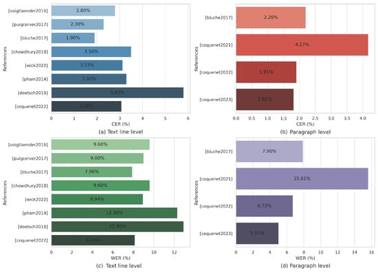 Furthermore, a novel approach was introduced that combines depthwise convolution with a gated-convolutional neural network and bidirectional gated recurrent unit []. This technique effectively reduces the total number of parameters while simultaneously enhancing the overall performance of the model. Authors of [,] presented Convolutional Recurrent Neural Network (CRNN) architecture; the latter utilized CRNN for handwriting recognition as an encoder for the input text lines while utilizing a Bidirectional Long Short-Term Memory (BLSTM) network followed by a fully CNN as a decoder to predict the sequence of characters. IAM and Reconnaissance et Indexation de données Manuscrites et de fac similÉS (RIMES) [] with the newly created dataset (EPARCHOS) [] that includes historical Greek manuscripts have been used in the evaluation process of the proposed architecture. Experiments produced improved results compared with the other state-of-the-art methods, especially on the RIMES dataset. Table 1 summarizes the articles based on the architectures used at different HTR levels for different international languages.