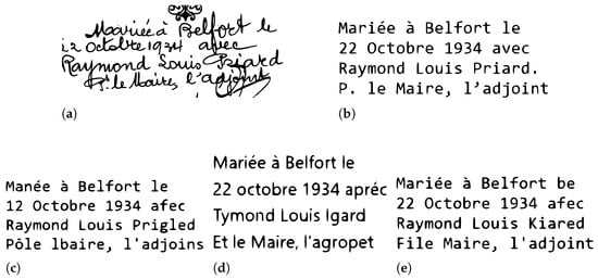 The study of the records of the commune of Belfort is very important for historical reasons: Belfort is a hapax in the French demographic landscape of the 19th century because, following the defeat of France against Prussia in 1871, this city experienced a mushrooming growth due to the influx of a large number of Alsatians, especially Mulhousians, who either decided to remain French after the annexation of Alsace–Lorraine by the newly created Germany or migrated to Belfort to continue working for the textile and mechanical industries that massively settled in the city after 1871. This city thus constitutes a privileged observatory of three major changes in characteristics of the European 19th century, in terms of urban growth, migration, and the sexualization of social relations. The historical issues that can be grasped from birth records alone are therefore numerous and important (study of midwives, concubinage, age at first child, inter-birth period and contraception, births outside of marriage, recognition of children, choice of witnesses for the declaration, choice of the child’s first name and home or hospital births). To effectively analyze and address these historical questions, it is essential to establish a comprehensive knowledge database that will facilitate their exploration and resolution. This process involves transcribing the archive contents through two approaches. The first is manual transcription by humans. However, this approach is expensive and time-consuming. The second is automatic transcription utilizing computer science methods.
