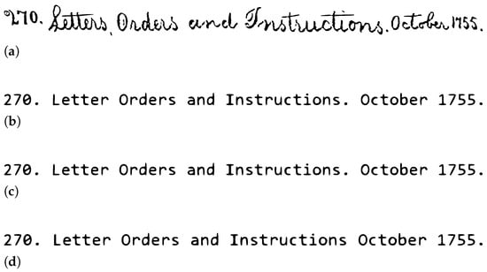 - Sánchez, J.A.; Romero, V.; Toselli, A.H.; Vidal, E. ICFHR2014 competition on handwritten text recognition on transcriptorium datasets (HTRtS). In Proceedings of the 2014 14th International Conference on Frontiers in Handwriting Recognition, Hersonissos, Greece, 1–4 September 2014; IEEE: Piscataway, NJ, USA, 2014; pp. 785–790. [Google Scholar]