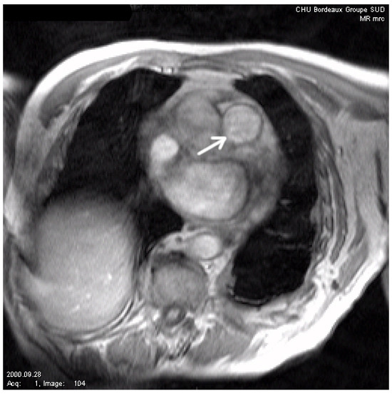 Figure 5. Initial image. The arrow shows the vessel to be segmented (main pulmonary artery).