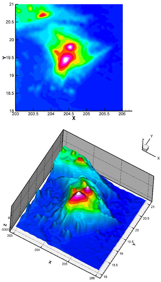 Here, we consider the energy functional E ( S ) of Equation (3) with α > 0 and β = 0 . The initial condition has no impact on the quality of the result (but it has a small impact on the CPU time). The considered dataset was obtained from the TOPEX project. The dataset is constituted of 8736 points giving the seafloor surface and topography of Maui and the Big Island, Hawai’i (Figure 8). This zone (around Mauna Kea) is of interest since it is the largest “mountain” on Earth from base to top (from −7000 m to +4207 m, so around 11,207 m in total) and this zone is in permanent evolution (Hawaiian hot point, with active volcanoes like Kilauea, Mauna Loa, Mauna Kea, or the youngest volcano Kama’ehuakanaloa). We give the approximation in Figure 9.