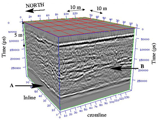 Figure 10. Example of a 3D seismic dataset wherein two continuous reflectors (layer A and layer B) appear.