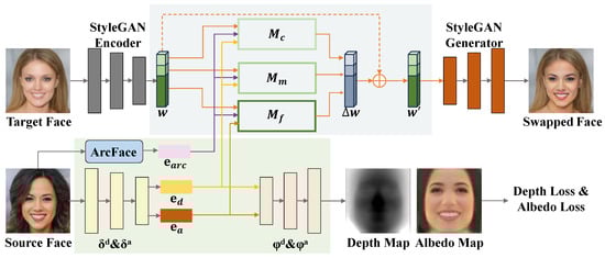 Based on the semantic levels to which different identity feature embeddings belong, we direct their injection into the corresponding mappers. Specifically, the depth embedding represents the global structure and contour, with a higher semantic level, and we inject it into and ; the albedo embedding represents the texture, with a lower semantic level, and we inject it into . The ArcFace embedding obtained from the 2D face recognition network represents the structure detail information of the internal face, so we inject it into all of the three feature mappers. Therefore, the output of the face feature mapper can be expressed as: