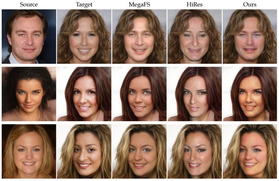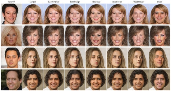- Xu, Y.; Deng, B.; Wang, J.; Jing, Y.; Pan, J.; He, S. High-resolution face swapping via latent semantics disentanglement. In Proceedings of the IEEE/CVF Conference on Computer Vision and Pattern Recognition, New Orleans, LA, USA, 18–24 June 2022; pp. 7642–7651. [Google Scholar]