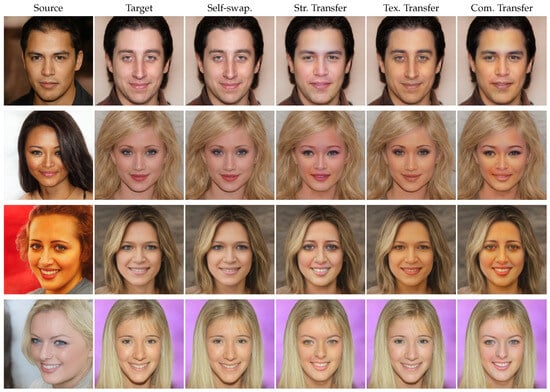 While texture-only transfer is performed, the face structure of the swapped face is basically the same as the target face, but the texture information changes considerably, which is more consistent with the source face. In the field of beauty-themed applications, such as Photoshop and beauty filters in mobile applications, texture-only transfer can be utilized to enhance and refine individuals’ appearances in photos. Users can modify their skin texture and complexion to achieve a more desired and aesthetically pleasing look while retaining their original facial structure. This serves to meet the ever-evolving standards of beauty in the digital age, providing individuals with a means to perfect their selfies and photographs before sharing them on social media or elsewhere.