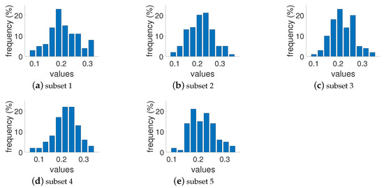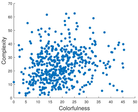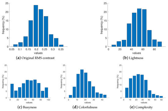 where : intensity of and pixel, : average intensity of all pixels, M and N: total number of image pixels. Pixel intensities are normalized in the range . Included attributes also present busyness [30] (indicating the presence of high frequencies and based on the Sobel edge detector), colorfulness (captures intensity and variations in color using deviations and means of the a and b color channels in the CIELAB color space) [31], lightness (average of the L channel in the CIELAB color space), and complexity [32] (average of the maximum gradient value in the LAB channels). As can be seen in Figure 1, the images presented in the collected dataset are diverse and normally or homogeneously distributed in terms of contrast, lightness, busyness, colorfulness, and complexity. We also checked the distribution of the images’ attributes in each subset, and they show similar results. The results of such a distribution for the RMS contrast attribute is presented in Figure 2, and an example of a relationship between two of the most representative attributes is illustrated in Figure 3. Sample images from the dataset with high and low values for each attribute are shown in Table 1.