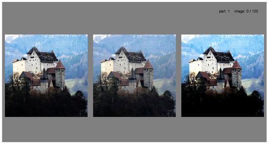 A total of 37 participants (20 male and 17 female) completed at least one subset of images. The participants were 20 to 40 years of age and had normal or corrected normal vision with no color deficiency. The majority of participants (25 people) had a background in either image processing or photography. After the instructions, the observers were presented with a series of three images with varying contrast levels. Participants were instructed to “choose the image you prefer” out of the three images displayed simultaneously. Before the experiment began, observers participated in a brief tutorial session that consisted of completing the entire process for an image. The order of the images was randomized for each participant to minimize any potential order effects. An example showing how the images were presented is illustrated in Figure 4. Out of the 37 observers, 25 finished evaluating all 599 images in the dataset. Observers were given the opportunity to participate in the experiment whenever possible, resulting in the completion time varying from a week to a month for different observers. The data-collection phase of the experiment lasted approximately three months.