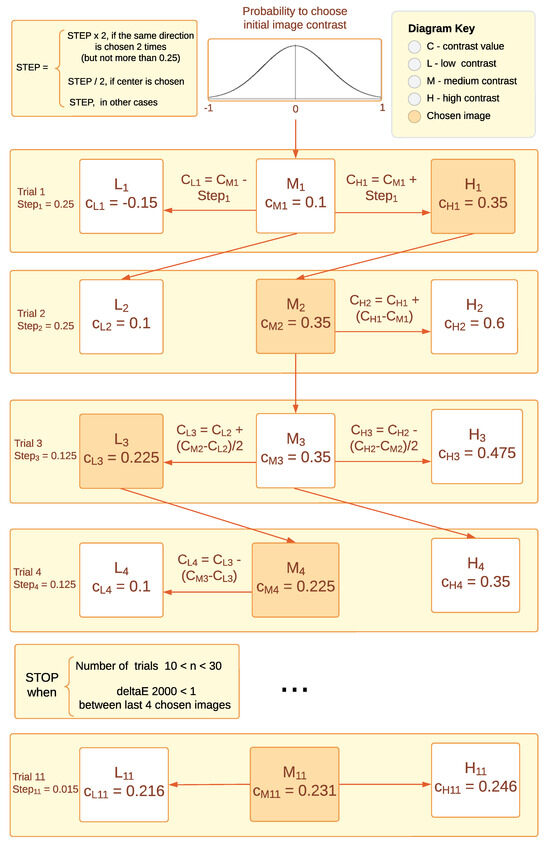 The methodology of our contrast-changing algorithm. Squares correspond to shown images of low, middle, and high contrast, and rows correspond to each trial, for which the chosen image is represented by an orange background. The formulas represent how other images were derived from the chosen one. The step change (contrast difference between images) and stopping rule are also represented.