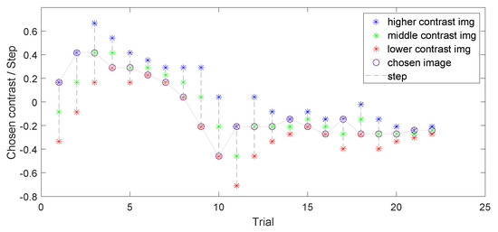 At the beginning of the experiment, the observer was presented with three randomly shuffled images of low, medium, and high contrast levels (Figure 4), and each subsequent stimulus level was determined based on the previous response. An example of how the algorithm works is illustrated in Figure 5. The starting level for the medium contrast image was selected from a normally distributed probability range between the minimum and maximum levels of contrast [−1; 1] and had no further impact on algorithm behavior. For the first triplet, the initial difference between low-, medium-, and high-contrast images was set to 0.25. This contrast level was selected to enable easy differentiation between images while avoiding any annoyance forcing the observer to choose the middle contrast level in the first trial. The number of trials ranged from a minimum of 10 to a maximum of 30. During each step, the difference between contrast levels was reduced twice after each choice of the middle contrast, making it more challenging for each subsequent round, and it increased twice after two successive choices of higher or lower contrast. The goal was to reach a level where the observer does not see the difference between images anymore and is satisfied with the contrast level of the three images being displayed. The stopping rule examined the visual difference between the last four chosen images and concluded when Delta-E 2000 [64] remained less than 1, which corresponds to the Just-Noticeable Difference (JND) in color perception as reported by the CIE standard [65]. Although Delta-E 2000 was primarily designed for use with solid colors, it is also used to work with images, and it works well in the design of a stopping rule. An example of the work of this algorithm is shown in Figure 6, wherein 22 trials were done before the stopping rule was enforced. In the first trial, the higher-contrast image was chosen, then in the second trial, the higher-contrast image was chosen; however, the middle-contrast image was selected in the third trial. We can see that when the middle-contrast image was selected, the range for the next trial was reduced to half. Later, for the sixth trial, the lower-contrast image was selected and the range was then further increased.