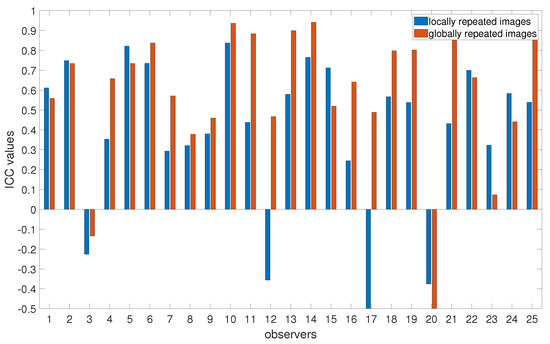where corresponds to the Mean Square for the observers (variance between observers), is the Mean Square Error (variance within images, representing random error), is the Mean Square for Cases (variance between images), n is the number of images, and k is the number of trials (two for local, five for global). ICC is computed by evaluating the variance attributed to observers − in relation to the variance attributed to images − all while taking the sample size n into account. The ICC values usually range from −1 to 1, with higher values indicating higher reliability, while negative values indicate poor reliability. The results for the ICC values are presented in Figure 8. The results suggest that Observers 3 and 20 have the poorest reliability for both locally and globally repeated images, while Observers 12 and 17 reveal inconsistencies for locally repeated images. From Figure 8, we can also conclude that ICC values are higher for globally repeated images compared to locally repeated mages. This difference comes from a higher absolute difference in chosen contrast values between the first and second trials for locally repeated images compared to the averaged contrast values for five globally repeated images, which leads to smaller and, in turn, a higher ICC value. Even despite the longer intervals between the evaluations of globally repeated images, the fact that they were assessed multiple times can potentially result in better recall and more consistent responses from observers.