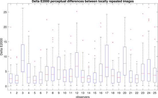 Delta-E 2000 for locally repeated images. Blue boxes indicate the range of majority values between the 25th and 75th percentiles, red lines indicate median values, whiskers extend to the furthest data points, while outliers are indicated by red crosses.