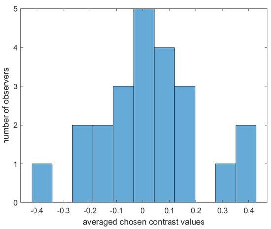 Distribution of preferred contrast level values among observers. The values were averaged for each observer across all 499 images.