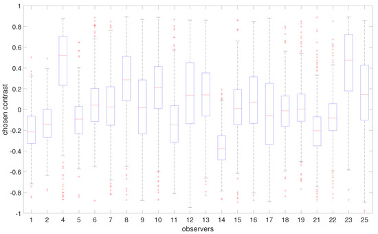 Summary of observers’ preferred contrast. The boxplots show the deviation in observers’ preferences. Some observers have stronger preferences for particular contrast ranges, while the preferences of others vary across different images. Blue boxes indicate the range of majority values between the 25th and 75th percentiles, red lines indicate median values, whiskers extend to the furthest data points, while outliers are indicated by red crosses.