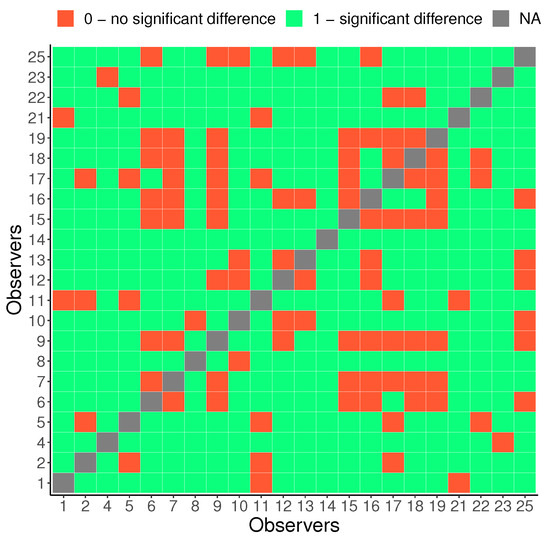 Our aim is to investigate whether there are variations in contrast preferences among individual observers. Figure 10 shows the distribution of the chosen contrast level values in all images averaged for each observer. Please note that 0 corresponds to an image with slightly higher contrast (0.2 of the original image contrast), which is accounted for in our analysis. Therefore, when we mention 0, we are referring to the “original” image contrast. Although a majority of observers tend to prefer images with contrast levels similar to those of the original image, there is evidence of some disagreement among them. Figure 11 gives more insight into the actual distribution of preferred contrast levels in all images for each observer. However, to determine whether there are significant differences between observers, we performed a sign test with Bonferroni correction [73]. The findings are presented through a confusion matrix (Figure 12), where red indicates no significant differences and green represents the differences between each pair of observers. Through this analysis, we can see that some observers have consistently significantly different responses, while others do not show any such patterns in their responses.