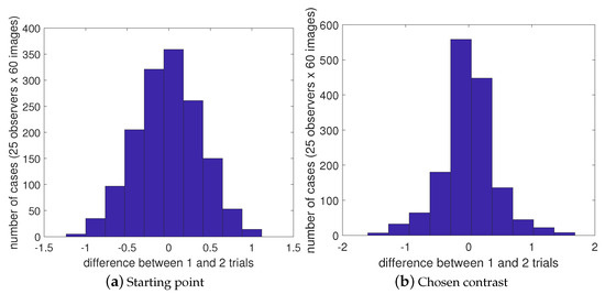 We performed an additional test to ensure a normal distribution for the starting point and chosen contrast in cases of locally repeated images. We examined the differences in starting points and selected contrasts between the first and second trials when evaluating locally repeated images. The differences (Figure 13) were normally distributed around zero, indicating that there was no significant bias or skewness in the randomization of starting points or in the judgments made by the observers.