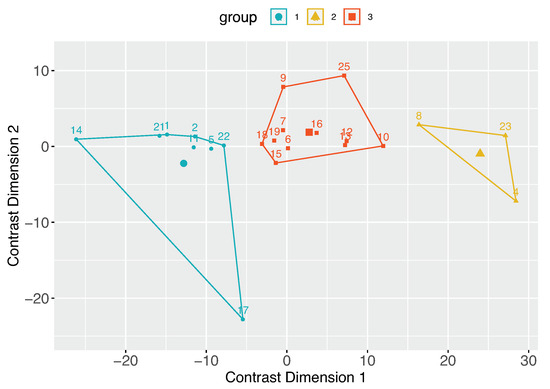 Observers clustered based on their shared contrast preferences. From now on, these are referred to as Group 1, Group 2, and Group 3. Numbers in the figure represent observer IDs.