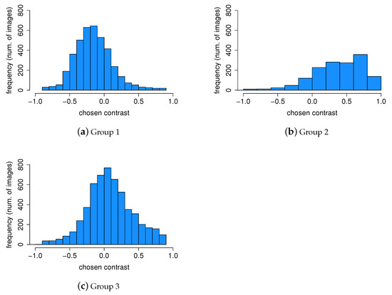 Contrast preference distribution within groups. Group 1 (a) prefers lower contrast, Group 2 (b) strongly prefers high-contrast images, while Group 3 (c) prefers images with slightly higher and natural contrast.