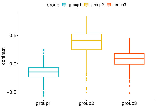 In Figure 16, we can see the differences in the distributions of preferred contrast values represented in the boxplots for each group. To determine if the differences between the groups are significant, we can use parametric or nonparametric tests. First, we checked if our data are normally distributed. For this, we ran the Shapiro–Wilk [74] and Kolmogorov–Smirnov [75] tests. Both tests reported significantly small p-values, indicating that the data are not normally distributed. Therefore, we chose the Kruskal–Wallis test [76] to check if there are significant differences between the three groups and the Wilcoxon signed-rank test on paired samples [77] to check the significance between each pair of groups. The Wilcoxon test assumes that the differences between paired samples are symmetrically distributed around the median, and this assumption is satisfied in our case. The results of the tests are shown in Table 3. Both tests show statistically significant differences between the means of the groups, with p-values close to zero.