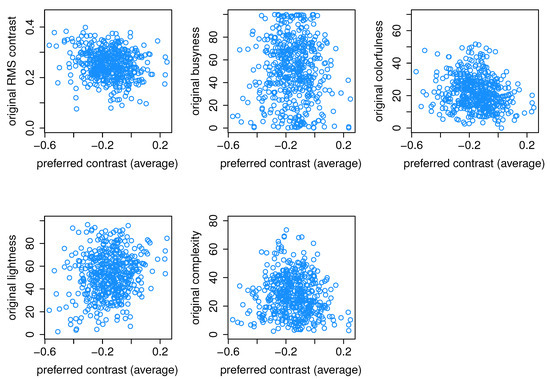 We also explored the relationship between the image attributes (Figure 1) and the preferred contrast levels within each group. This analysis is aimed to determine whether the appearance of an image can provide valuable insights into contrast preferences for the observers. Figure 17 displays, as an example, a scatter plot between five image attributes: original RMS contrast, busyness, lightness, colorfulness, complexity, and preferred contrast levels averaged for observers of Group 1, but no significant relationship was found. Although there is a slight tendency for images with lower complexity and higher lightness to be preferred with higher contrast, it is important to note that these relationships are not statistically significant. Similarly, we checked Groups 2 and 3, and no significant relationships were found either.