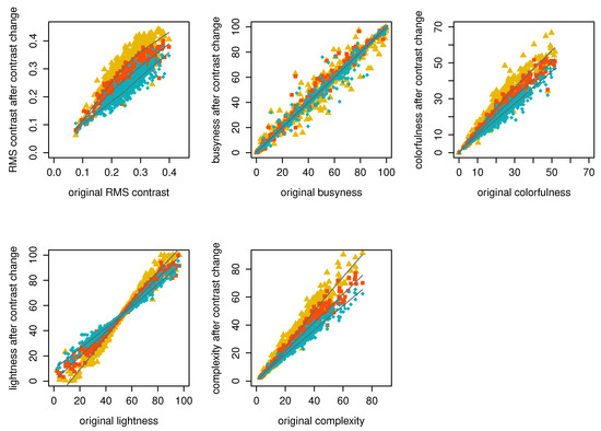 To see if there are differences between images chosen by the three groups, we also plotted each of the attributes against the original image attributes. Figure 18 represents the distribution of each of the 499 image attributes corresponding to an averaged image chosen by the observers of each of the three groups (i.e., preferred contrast value was averaged for each image within each group). Median lines help to see approximate distributions and mitigate occlusions. From the plots, we can see the changes in each attribute. RMS contrast shows that the original contrast is lower for Group 1, higher for Group 2, and slightly higher for Group 3, which supports the results and Figure 15 and Figure 16. Busyness, which is based on the Sobel edge detector, is not affected by contrast change. Colorfulness increases with increasing contrast, as does complexity; these are slightly increased for Groups 1 and 2. Because complexity is related to the maximum gradient values in the L, A, and B color channels, and the gradient values in the L color channel increase with higher contrast, this supports our findings. Colorfulness is related to the mean and deviation of the a and b channels; it also increases with higher contrast. For lightness, dark images become darker and bright images become brighter, which happens for Group 2 with increasing contrast, while the opposite happens for Group 3, for whom images with extreme lightness levels are flattened towards the middle while middle lightness level 50 stays the same, which also supports our findings.
