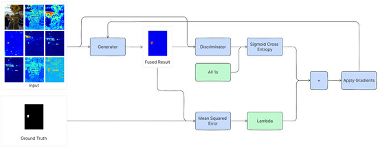 Second, the generator aims to minimize the difference between the fused heatmap and the ground truth. This is achieved by using the L2 loss, also known as the Mean Squared Error (MSE), between the fused heatmap and the ground truth. The overall loss is the sum of the sigmoid-cross-entropy loss and the MSE (the latter first multiplied by lambda, which is set to , as conducted in Pix2Pix [42]). This combined loss adapts the generator’s neural network weights during training, causing it to become better at generating good fused heatmaps.