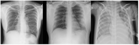 The datasets used in this research were collected from two datasets: the first was from [6], titled “Extensive COVID-19 X-ray and CT Chest Images Dataset” (Available online: https://dx.doi.org/10.17632/8h65ywd2jr.2 (accessed on 25 June 2023 )); the second was from the Kaggle site (Available online: https://www.kaggle.com/paultimothymooney/chest-xray-pneumonia (accessed on 12 June 2023)) that was obtained from [7]. In the collection step, we considered a focus on having a balanced dataset by ensuring that each class comprised almost the same number of X-ray images, each having 5000 X-ray images. Figure 2 shows an example of the collected dataset (X-ray images) with three classes: Normal, COVID-19, and Pneumonia, respectively, from left to right.