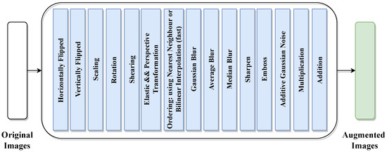 As shown in Figure 4, we applied several data-augmentation techniques, such as scaling, rotation, multiplication, addition, horizontal and vertical flipping, Gaussian blur, shearing, and so on. After applying the augmentation techniques, the number of images reached 216,000 images; we computed this number by multiplying the number of original training images by the number of augmentation techniques used, which was 15. Finally, we added the results to the number of original training images number ((13,500 × 15) + 13,500 = 216,000). Table 4 illustrates the description of the image-augmentation techniques used.