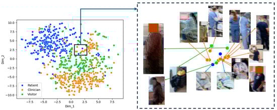 As illustrated in Figure 2, three clusters of individuals are observed. Patients predominantly cluster in the upper section of the plot, indicating that their visual features are distinct from other categories. The categories of clinicians and visitors exhibit some degree of clustering with notable overlap. This overlap suggests that the visual features used to annotate these two groups might share similarities, potentially due to overlapping elements in their appearances or physical characteristics in the ICU room. This insight is crucial for refining our algorithms and improving the accuracy of class distinctions within the dataset.