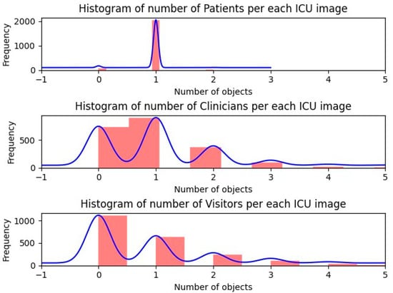 Figure 3 offers a detailed analysis of the histogram distributions for each object category within ICU rooms. It illustrates that most images captured feature only one patient per room, indicating a common scenario in these settings. In contrast, the distributions for visitors and clinicians show differing patterns. The clinician category typically concentrates around the presence of zero or one clinician per room, suggesting that it is common to have at most one clinician present at any given time. On the other hand, the distribution for visitors is more varied and extends further along the x-axis. This shows more variability in how many visitors might be present in different scenarios within the ICU.