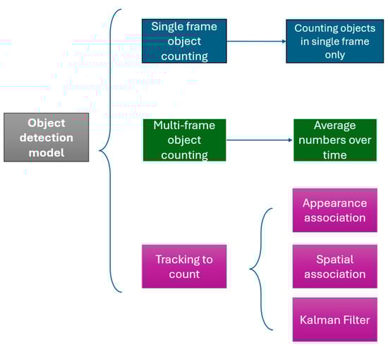 To achieve a people counting pipeline, we used an object detection framework [] to gauge room occupancy and used three distinct methodologies: single-frame object counting, multi-frame object counting, and object tracking. A schematic summary of our methodology is presented in Figure 4. We split the dataset into training (80%) and validation (20%) sets.
