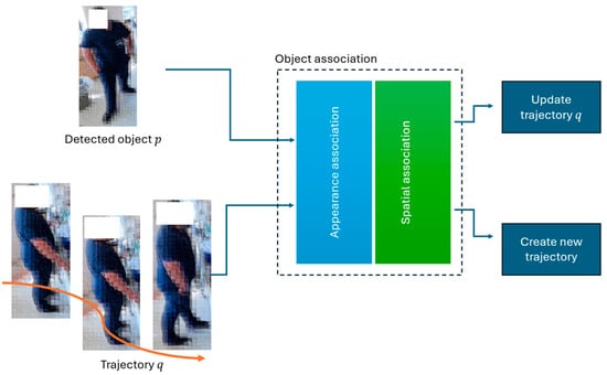 Multi object tracking mechanism. Our tracking pipeline operates across a sequence of multiple frames. In each frame, it seeks to associate detected objects (e.g., object p) with all existing trajectories (e.g., trajectory q) that have been constructed up to that frame. If a detected object is associated with one of the existing trajectories, that trajectory is extended; otherwise, a new trajectory is initiated. Due to privacy considerations, images of individuals are de-identified and blurred.
