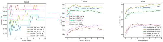 Figure 7 shows the effect of the length of frame intervals on counting performance. In this experiment, the people counting was conducted 30 times utilizing different intervals. It is apparent that increasing the frame interval can mitigate inaccuracies caused by occlusions or false alarms, thus improving overall performance. However, the optimal interval for extension differs among object categories. Specifically, extending the interval to 30 frames generally resulted in more accurate patient counts. In contrast, for the clinician and visitor categories, extending beyond 15 frames did not yield significant performance gains. The Faster RCNN variant exceled in counting clinicians and visitors, while Retinanet models performed best in counting patients.
