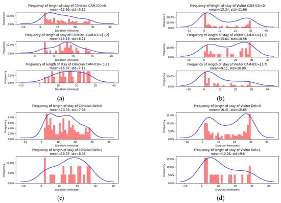 Interestingly, the data indicate a potential inverse relationship with visitors. Figure 8b,d depict that visitors spent an average of 16.51 min in the rooms of non-delirious patients, but only 12.01 min with delirious patients. This contrasting behavior underscores varying interaction patterns, which may be influenced by levels of comfort or ability to interact with the patient in the presence of delirium.