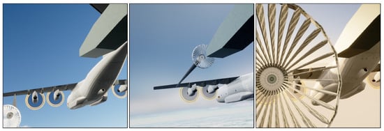To generate the simulation images, in [], the use-case of aerial refueling and relevant standard documents were analyzed. From this research, authors derived parameters relevant for a diverse data generation. Additionally, a toolchain to generate images of an aerial refueling situation under different environmental conditions was developed using the Unreal Engine. Using this toolchain and the derived parameters, simulation images were generated. The parameters were selected so that they align with the processes described in the aerial refueling standards and not to exactly represent the available real-world data to not introduce bias. Only the camera parameters like field-of-view and resolution were taken from the real-world camera and the used 3D models were selected to be similar to the aerial objects of the real-world images. For this work, approximately 17,500 simulation images are available. The simulation dataset is split into a training, a validation, and a test dataset called , and . They contain approximately 60%, 10%, and 30% of the images, respectively. Some example images are shown in Figure 2. Based on the generation process of the simulation images, both datasets visually depict the same scenario as can be seen in Figure 1 and Figure 2. Although there are no exact matching pairs between the simulation and real-world images, they are visually comparable. Visual differences between the simulation and the real-world images can mainly be observed in the rotors of the tanker aircraft as well as in the probe of the refueling aircraft. Furthermore, some differences in photometric characteristics may be observed.