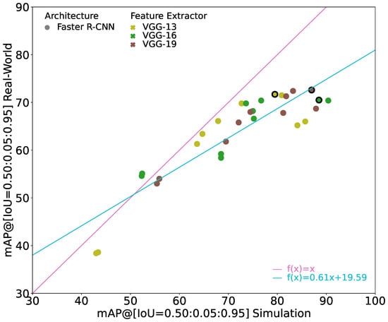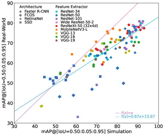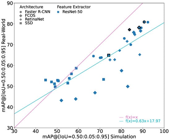 Definite reasons and influences on this generalization problem have not yet been found. On an abstract level, the three main components of a deep learning system are data, models, and learning []. Therefore, all three components could have influence on the generalization problem. Previous works have mainly focused on the influence of the data. This is a reasonable approach as the data are the input for the training process and differences may be seen with the naked eye. Furthermore, some works have looked into the learning process by investigating different forms of domain adaptation to make the object detection model learn more robust features that could generalize to real-world images (see, e.g., [,]). To the best of our knowledge, the influence of the object detection model architecture on the generalizability from simulation to real-world images has not yet been studied. However, we believe that it may also have a significant influence. On the one hand, it is a main component of the deep learning system as described above. On the other hand, different object detection model architectures have been developed in the past years which accomplish certain accuracy improvements. However, it has not been studied whether these improvements also translate to improvements with respect to their generalizability from simulation to real-world images.