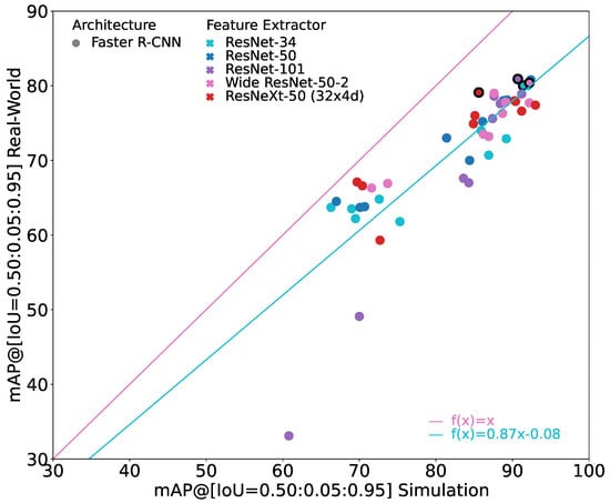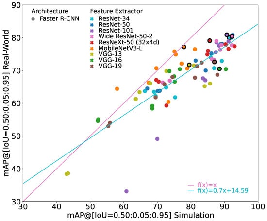 As a result, much work has been conducted to investigate and close the gap. In this context, most work is conducted on the data side, see, e.g., [,,,,,]. On the model side, to the best of our knowledge, not much research has been conducted regarding the influences on the sim-to-real gap. However, it is obvious that some models have better object detection performance than others [,]. It may be possible that the same applies for the generalizability from simulation to real-world images. For example, in the context of person detection in artwork, the performance of a YOLO model [] has been shown to degrade less than other models when trained on real-world images and being applied to artwork [].