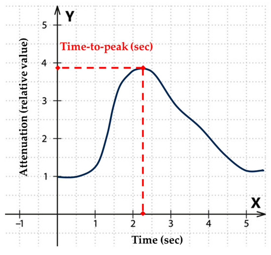 Calculation of the time-to-peak (TTP) parameter from the time–attenuation curve. The red dotted lines indicate the level of peak attenuation (vertical line) and the time at the peak (horizontal line).