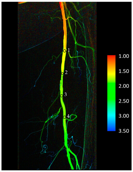 Typical placement of region of interests (ROIs) on a color-coded DVA image. The color bar shows the connection between the colors and the elapsed time (in seconds) measured from the injection of contrast media. In three cases (iliac and talocrural lesions), there was no space to place the fourth ROI. The ‘change in passage time’ calculations did not include these patients. The numbers besides the round shaped selections (ROIs) are serial numbers, indicating the sequence of ROI placement.