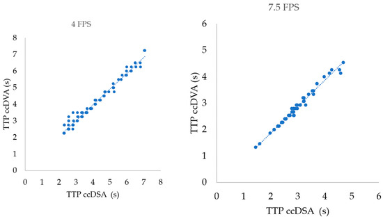 Correlation of TTP values calculated by ccDSA and ccDVA in different acquisition protocols. Left panel: correlation of 106 ROI pairs in 4 FPS acquisitions. Right panel: correlation of 64 ROI pairs in 7.5 FPS acquisitions.