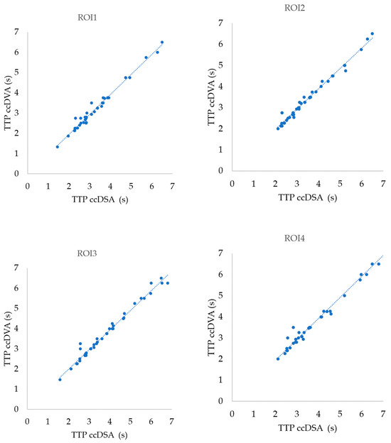 Correlation of TTP values calculated by ccDSA and ccDVA in different ROI positions. In all cases, 44 ROI pairs were included in the analysis except for ROI4, where only 38 ROI pairs were used.