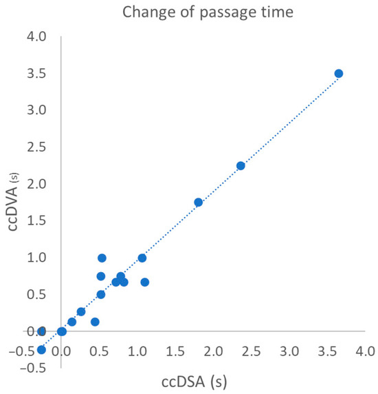 Correlation of the change in passage time calculated from TTP data of ccDSA and ccDVA. We could not place the 4th ROI in 3 interventions. Therefore, only 19 ROI pairs were used in the analysis. The change in passage time was calculated as the differences in (TTPROI4-TTPROI1) before and after intervention.