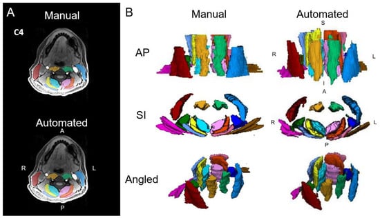 (A) Axial cervical spine muscle segmentations at the C4 vertebral level from manual segmentation and an automated computer-vision model overlaid over a water image from Dixon fat–water MRI. (B) Three-dimensional renderings of cervical spine muscle segmentations. The muscle groups segmented include the multifidus and semispinalis cervicis (left = light pink, right = aqua), longus colli and longus capitis (left = light green, right = gold), semispinalis capitis (left = orange, right = yellow), splenius capitis (left = dark pink, right = light blue), levator scapula (left = indigo, right = dark green), sternocleidomastoid (left = blue, right = red), and trapezius (left = brown, right = magenta). L = left, R = right, A = anterior, P = posterior, S = superior, I = inferior. Adapted from Weber et al., 2021 [].